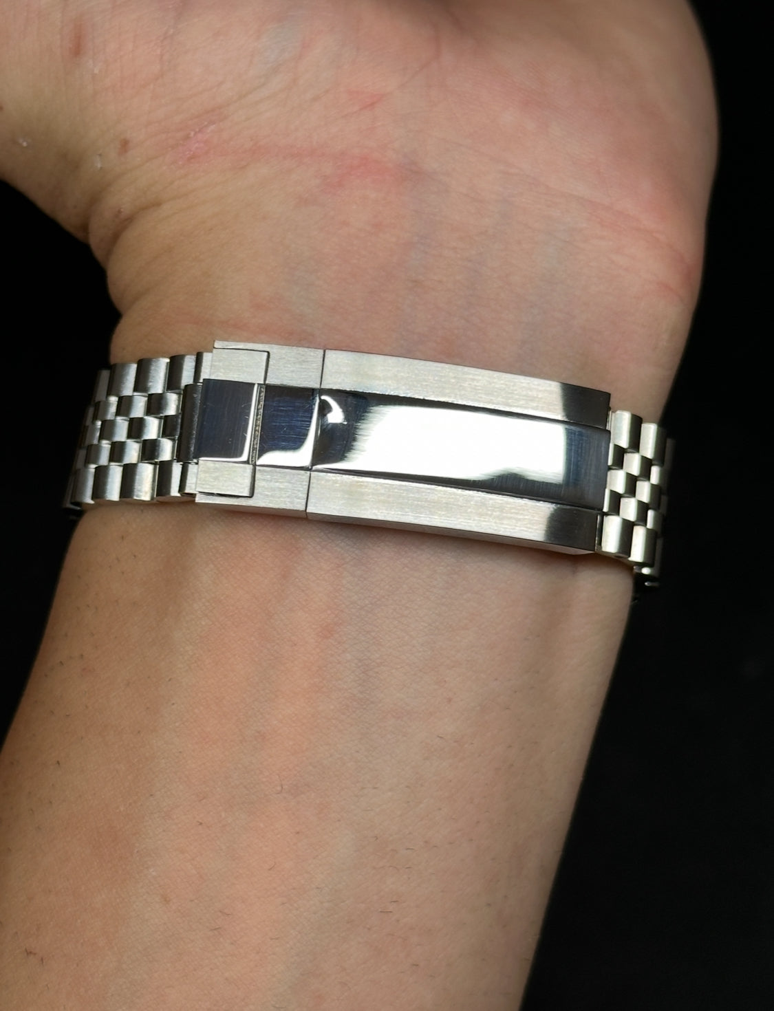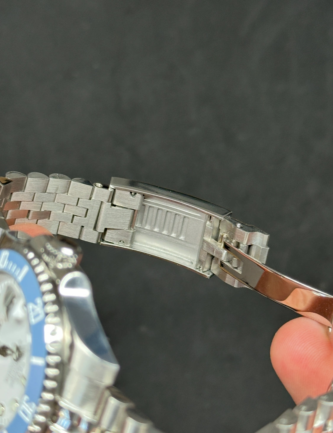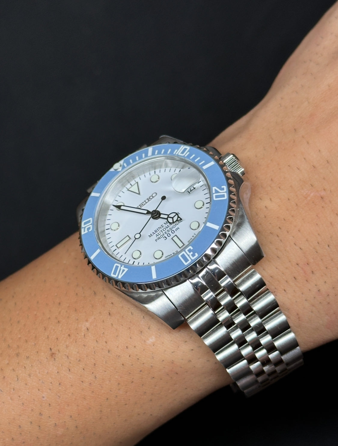 Su esfera blanca perlada resalta con un bisel cerámico azul marino, evocando la frescura del océano y la serenidad de la arena blanca.