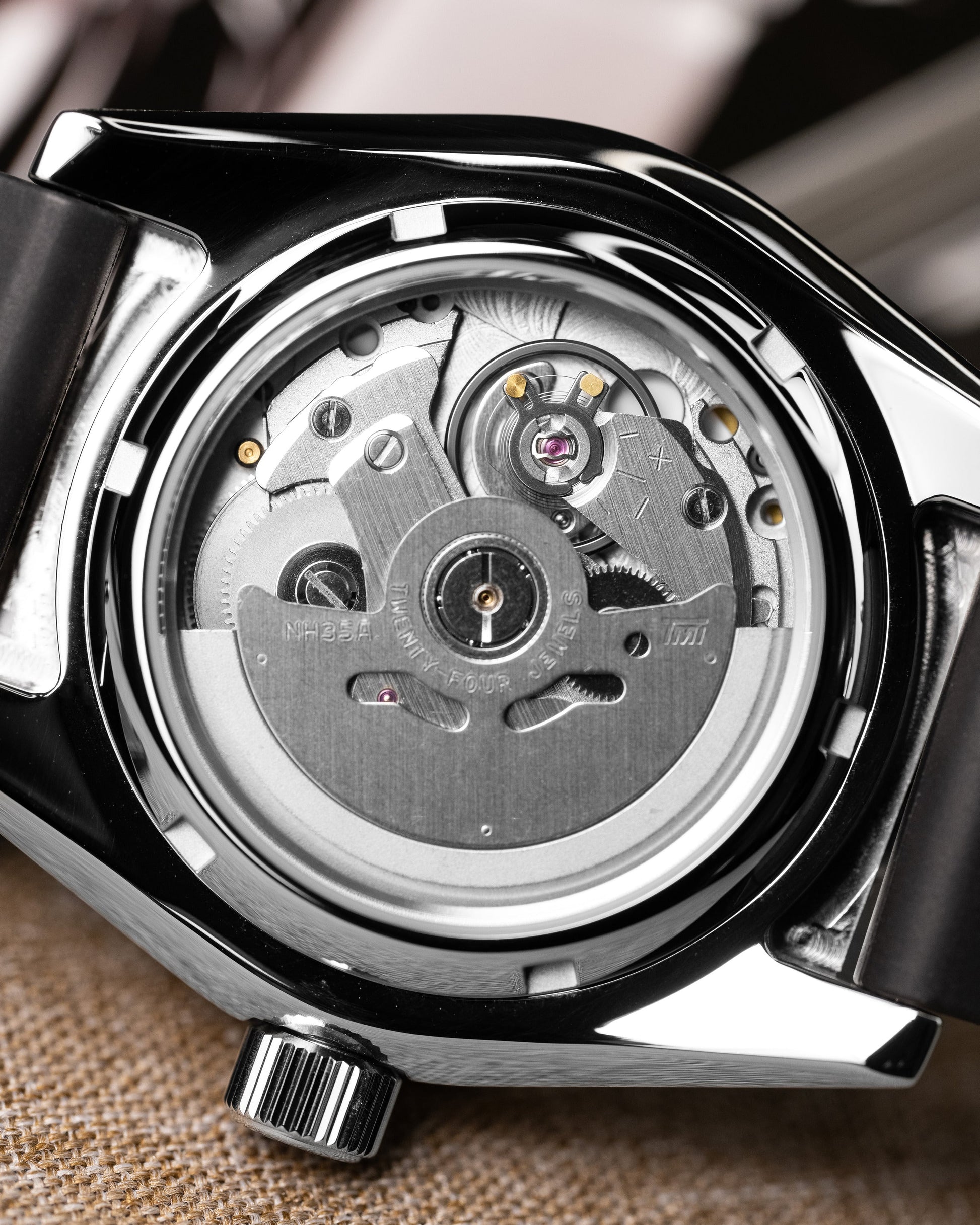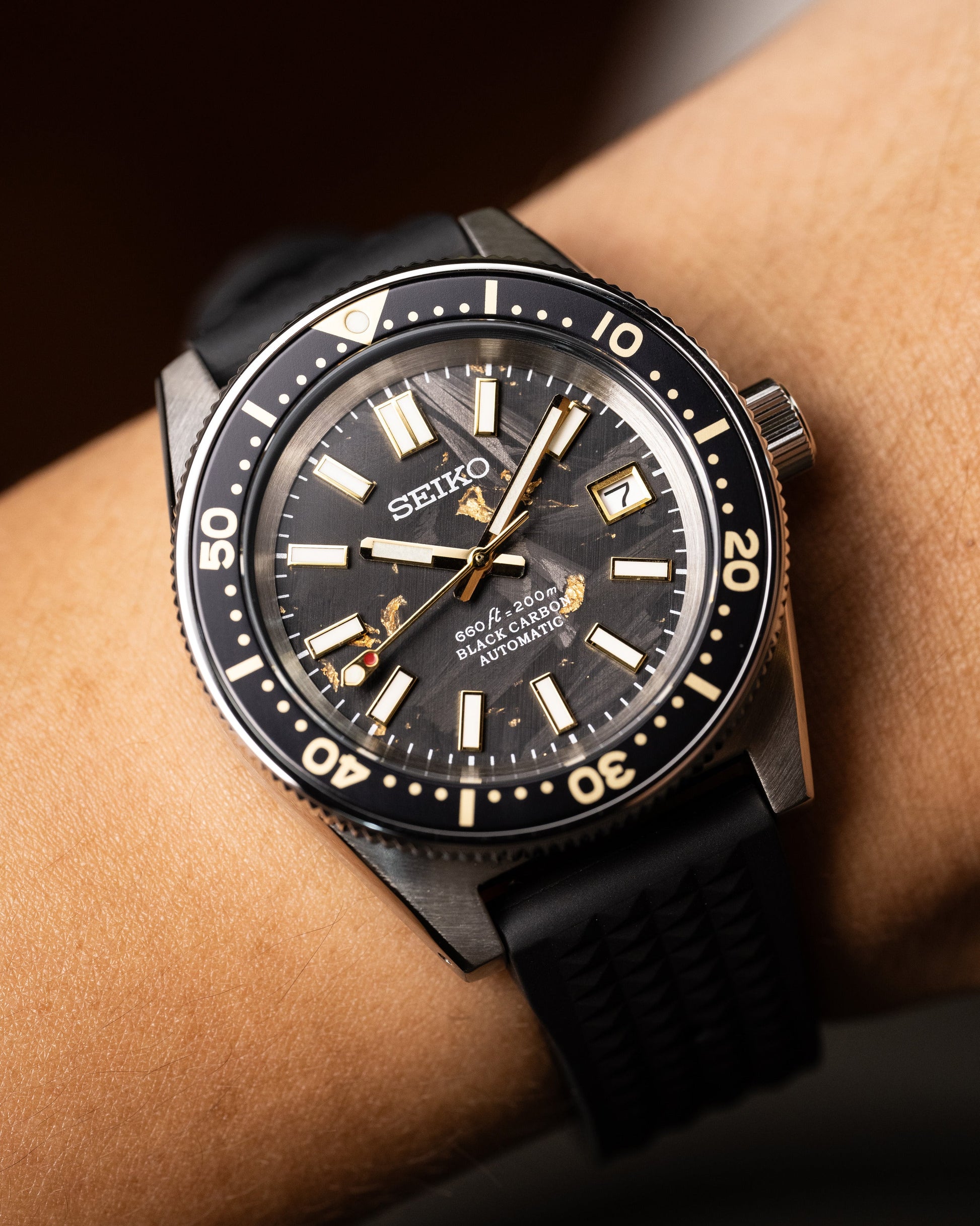 Lo más destacado de este modelo es la increíble esfera de carbono negra y dorada. Está llena de hermosas estrías que van del negro intenso al gris oscuro y está perfectamente terminada con llamativos depósitos de oro. Todo ello enmarcado increíblemente por un bisel vintage de aluminio negro con adornos dorados brillantes. Se adapta perfectamente a una correa de caucho negra tipo gofre. Es para quienes aman ese aspecto vintage pero aún así quieren algo un poco más especial.