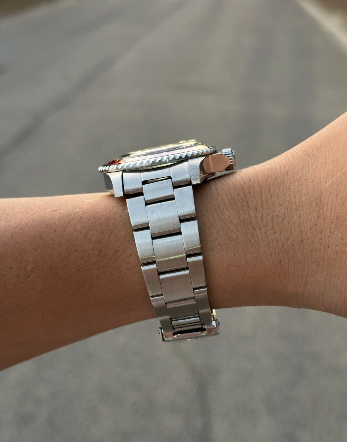 Este modelo ha sido cuidadosamente personalizado con materiales de alta calidad: bisel bicolor de estilo pepsi corona roscada para una mejor estanqueidad. Todo ello ensamblado sobre una caja con acabados cepillados y pulidos que evocan los modelos históricos.